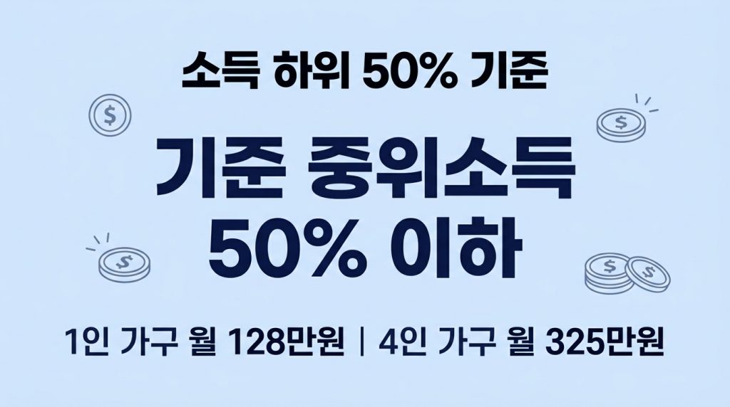 1인 가구 기준으로는 월 약 128만 원 이하, 4인 가구 기준으로는 월 약 325만 원 이하여야 소득 하위 50%에 해당합니다.