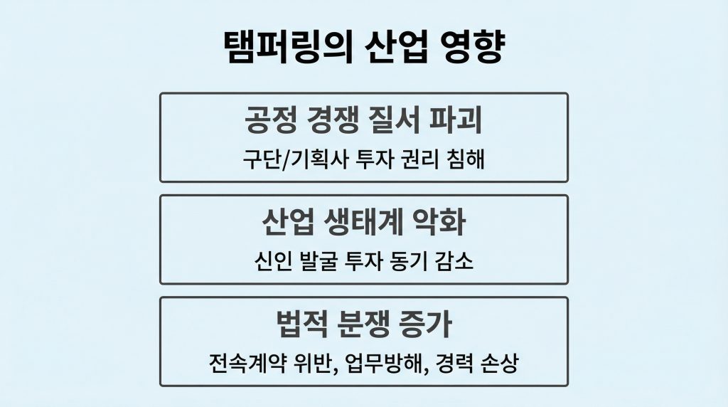 탬퍼링은 단순히 개별 사건을 넘어서 산업 전체의 공정한 경쟁 질서를 위협합니다. 스포츠계에서는 선수 육성에 투자한 구단의 권리를 침해하고, 리그 전체의 균형을 무너뜨릴 수 있습니다.