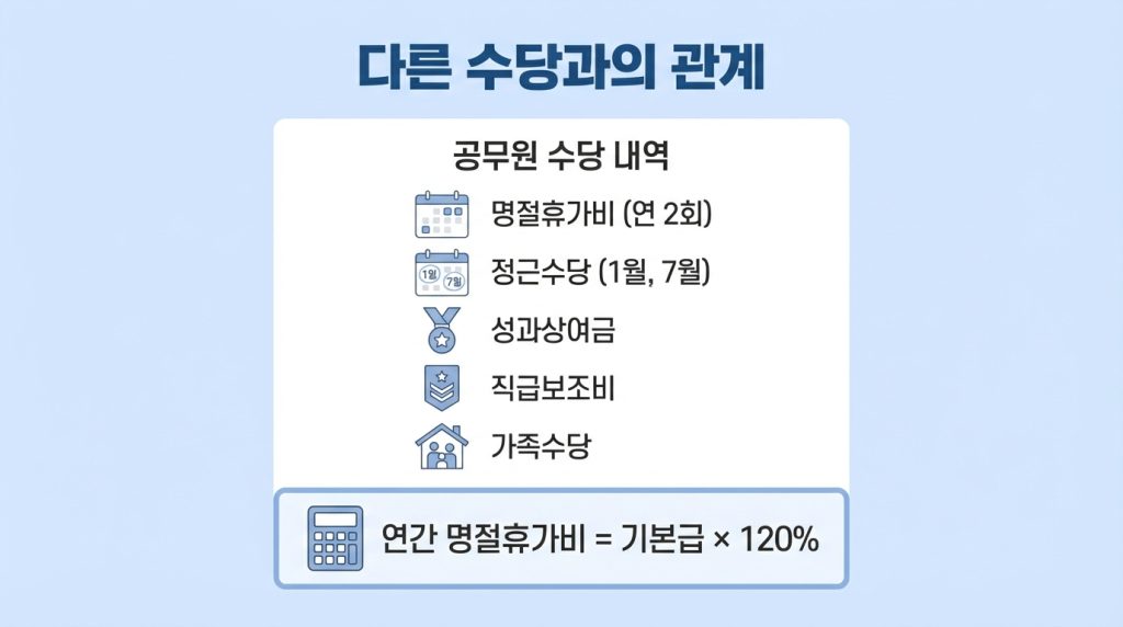 명절휴가비는 공무원이 받는 여러 수당 중 하나입니다. 공무원은 기본급 외에도 정근수당, 성과상여금, 직급보조비, 가족수당 등 다양한 수당을 받습니다. 명절휴가비는 연 2회 지급되므로, 연간 총 기본급의 **120%**를 명절휴가비로 받는 셈입니다.