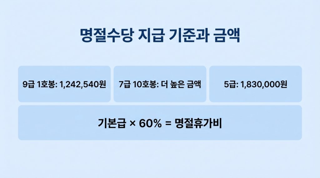 2026년 기준으로 9급 1호봉 공무원의 기본급은 2,070,900원이며, 이 금액의 60%인 약 1,242,540원을 명절휴가비로 받습니다.