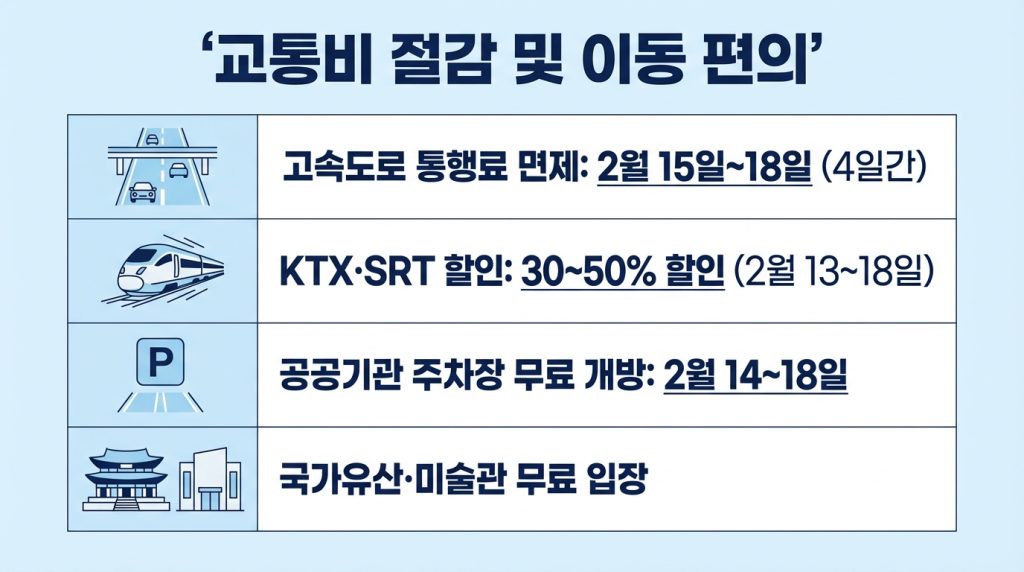 | 고속도로 통행료 | 2월 15일~18일 4일간 전면 면제 |